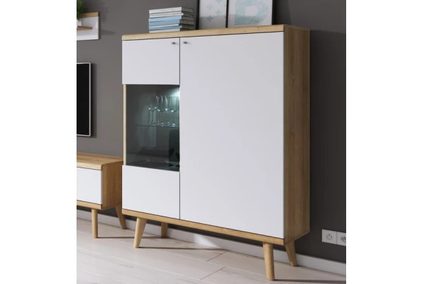 Nízká vitrína z programu Primo v příjemném skandinávském stylu. Kombinaci dubového dřevodekoru a bílé barvy doplňují zaoblené hrany a masivní nohy, které dodávají nábytku nezaměnitelný vzhled.