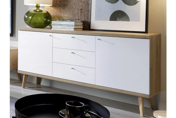 Široká komoda z programu Primo v príjemnom škandinávskom štýle. Kombináciu dubového drevodekoru a bielej farby dopĺňajú zaoblené hrany a masívne nohy, ktoré dodávajú nábytku nezameniteľný vzhľad.