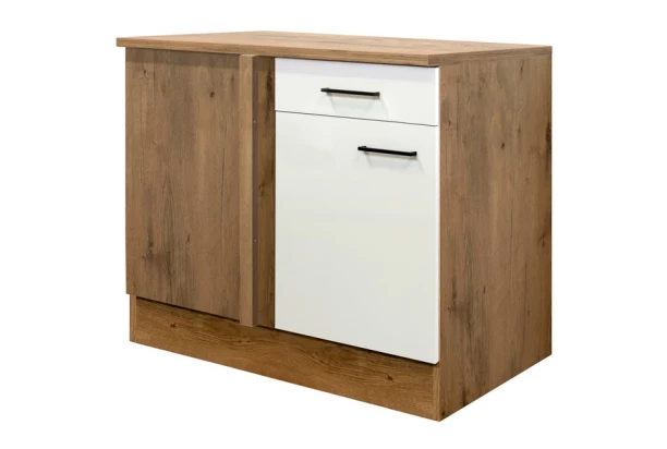 Dolná rohová kuchynská skrinka so šírkou 110 cm z moderného kuchynského programu Avila – útulná kombinácia dekoru dub lancelot a svetlo krémovej farby dopĺňa kontrastne čierny úchyt. Elementy kuchynského programu Avila môžete medzi sebou ľubovoľne kombinovať a zostaviť si tak kuchyňu podľa Vašich individuálnych potrieb a priestorových možností.