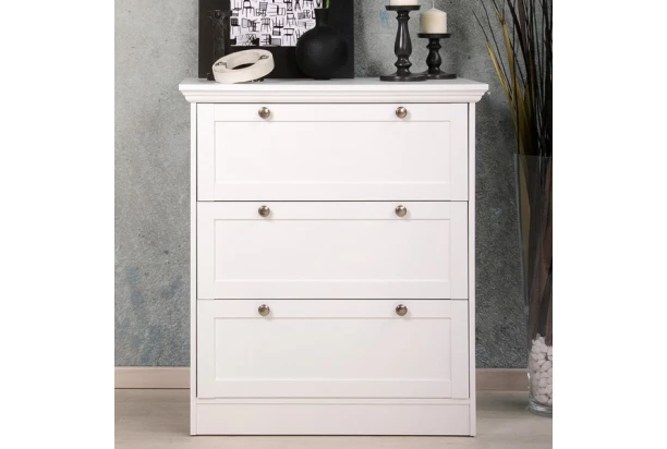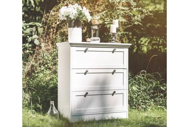 Komoda so zásuvkami z programu Landwood – tradične biely nábytok s okrasnou rímsou v romantickom vidieckom štýle. Vytvárajte si tak ľahko pôvabné interiery s nádychom tradície a kúzlom atmosféry vidieka.
