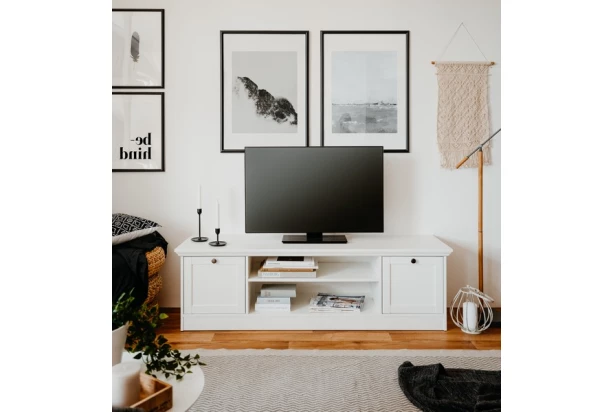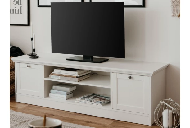TV skrinka z programu Landwood – tradičný biely nábytok s okrasnou rímsou v romantickom vidieckom štýle. Vytvorte si tak pôvabné interiery s nádychom tradície a s kúzlom atmosféry vidieka.