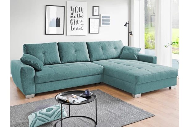 Doprajte si pohodlie, kvalitu i trendový štýl zároveň. Rohová sedacia súprava s komfortným vypolstrováním zaujme dekoratívnym prešitím sedadla i vankúšov. Univerzálny otoman možné umiestniť vpravo alebo vľavo a prispôsobiť si tak sedačku priestorovým možnostiam. Vrátane rozkladacej funkcie aj úložného priestoru pod otomanom. Sedačka je očalúnená petrolejovou látkou, ktorá je príjemne mäkká na dotyk.