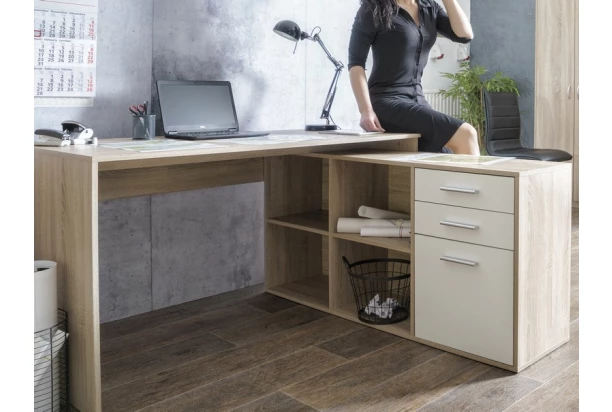 Rohový písací stôl v kombinácii dub sonoma/biela je príjemným ergonomickým prostredím, kde budete mať vďaka odkladacím priehradkám a úložným priestorom veci stále pri ruke. Skrinku možno k stolu univerzálne namontovať na pravú alebo ľavú stranu a prispôsobiť si tak nábytok podľa priestoru.