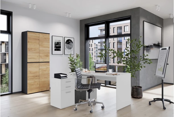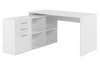 Rohový písací stôl v bielej farbe je príjemným ergonomickým prostredím, kde budete mať vďaka odkladacím priehradkám a úložným priestorom veci stále po ruke. Skrinku je možné k stolu univerzálne namontovať na pravú alebo ľavú stranu a prispôsobiť si tak nábytok podľa priestoru.