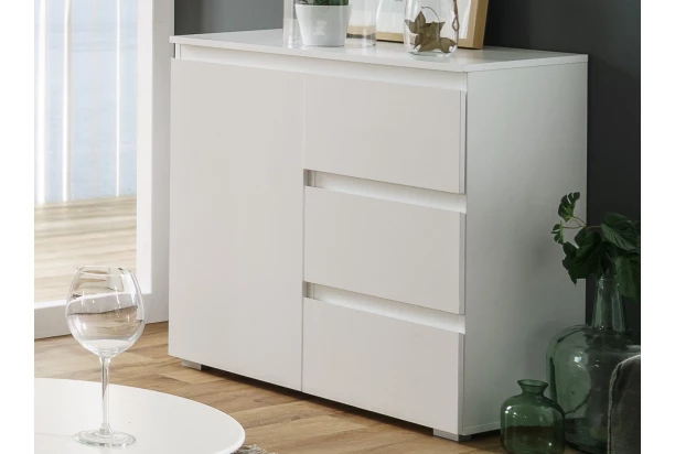 Komoda so zásuvkami z programu Image – minimalistický dizajn nábytku je úplne univerzálna a hodí sa do každého moderného interiéru. Táto skrinka obsahuje zásuvky a za otočnými dverami nájdete úložný priestor s policou na univerzálne ukladanie vecí.