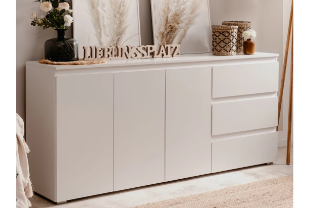 Široká komoda so zásuvkami z programu Image – minimalistický dizajn nábytku je úplne univerzálna a hodí sa do každého moderného interiéru. Táto skrinka obsahuje zásuvky a za otočnými dverami nájdete úložný priestor s policou na univerzálne ukladanie vecí.