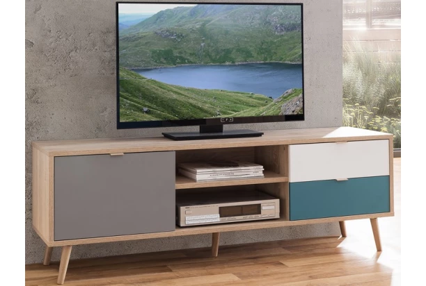 TV skrinka z programu Cuba – nábytok s nádychom škandinávskeho štýlu je vyrobený v dubovom drevodekore a doplnený atraktívnou kombináciou bielych, šedých a petrolejových plôch. Ľahko si tak zariadite byt príjemným a štýlovým nábytkom, ktorý len tak nikto nemá.