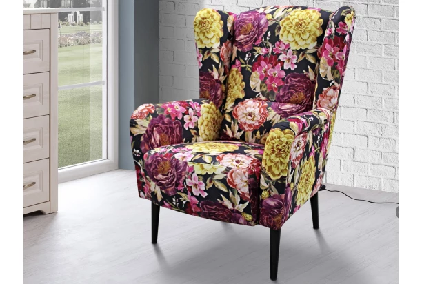 Elegantné kreslo typu ušiak poskytne príjemné komfortné sedenie v akejkoľvek miestnosti bytu. Vysoké operadlo dopĺňajú zaoblené bočné podrúčky a masívne nohy. Očalúnené čiernou látkou s atraktívnym motívom farebných kvetov.