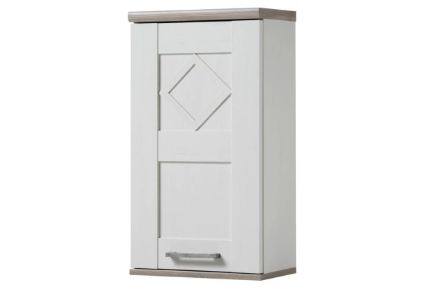 Závesná kúpeľňová skrinka Country – nábytok vo vidieckom duchu dopĺňa tradičné okrasné lišty predných plôch. V drevodekóre bielenej pínie s dubom nelson.