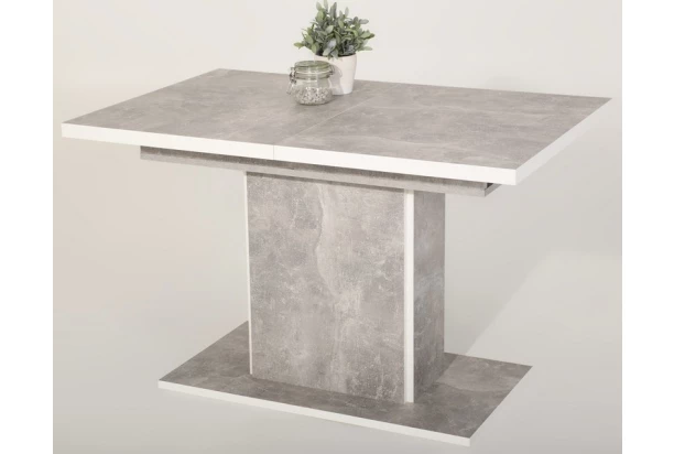 Jedálenský stôl na širokéj stabilnéj podnoži a v módnej imitácii šedého betónu a bielej farby. V prípade návštevy môžete 120 cm širokú jedálenský dosku rozšíriť na 160 cm pomocou rozkladacéj funkcie.