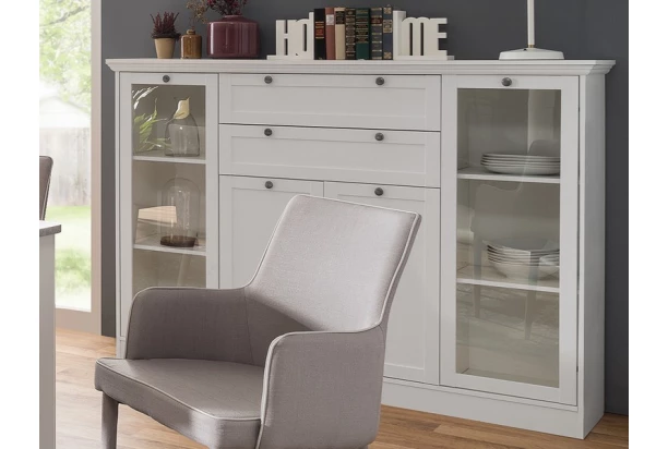 Vysoká komoda s presklením z programu Landwood – tradične biely nábytok s okrasnou rímsou v romantickom vidieckom štýle. Vytvárajte si tak ľahko pôvabné interiery s nádychom tradície a kúzlom atmosféry vidieka.