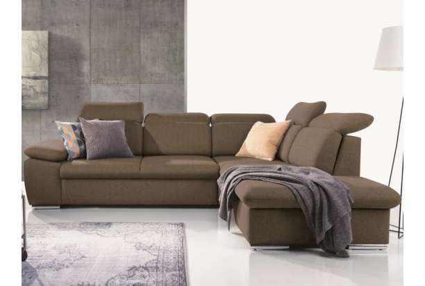 Elegantná rohová sedacia súprava s komfortne mäkkým sedením a polohovateľnými opierkami hlavy ponúka skvelé pohodlie i praktickosť. Variant s otomanom vpravo. Očalúnenie tkaninou v hnedom odtieni.