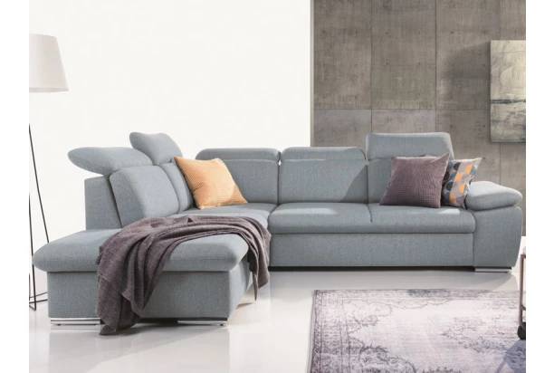 Elegantná rohová sedacia súprava s komfortne mäkkým sedením a polohovateľnými opierkami hlavy ponúka skvelé pohodlie i praktickosť. Variant s otomanom vľavo. Očalúnenie tkaninou vo svetlo platinovom sivom odtieni.