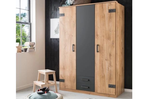 Praktická šatníková skriňa so zásuvkami v celkovej šírke 135 cm je inšpirovaná industriálnym štýlom. Dekor doskového duba a grafitu dopĺňajú dekoračné kovové aplikácie, ktoré skrini dodávajú zaujímavejšiu optiku.