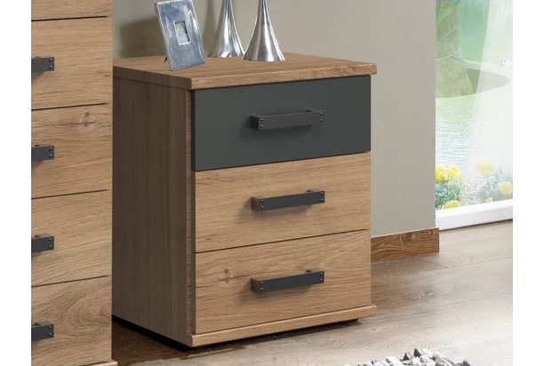 Skrinka so zásuvkami/nočný stolík s celkovou šírkou 46 cm je inšpirovaná industriálnym štýlom. Dekor doskového duba a grafitu dopĺňajú úchyty v imitácii tmavého kovu a skrutiek, ktoré skrinke dodávajú zaujímavejšiu optiku.
