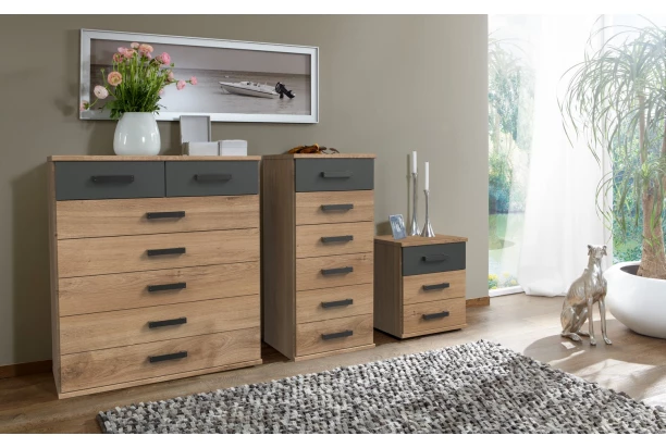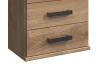 Úzka skrinka so zásuvkami má celkovú šírku 46 cm a je inšpirovaná industriálnym štýlom. Dekor doskového duba a grafitu dopĺňajú úchyty v imitácii tmavého kovu a skrutiek, ktoré skrinke dodávajú zaujímavejšiu optiku. Táto úzka komoda ľahko nájde miesto v spálni aj obývačke pre prehľadné ukladanie vecí alebo drobného prádla.