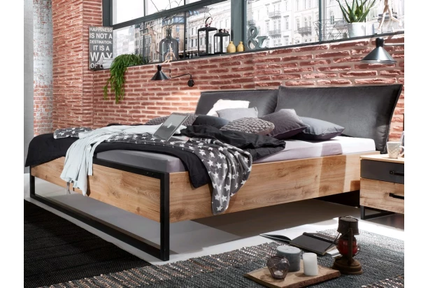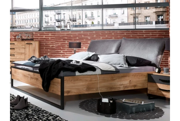 Dvojlôžková posteľ s veľkosťou 180×200 cm z kolekcie Detroit – inšpirujte sa mestským industriálnym štýlom a buďte jednoducho in. Útulné tóny drevodekoru doskový dub, dopĺňa komfortne vystlané chrbtové čelo v antracitovej vintage optike kože a čierna podnož, vďaka ktorej nábytok pôsobí veľmi vzdušne.