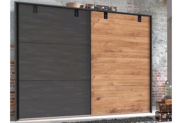 Šatníková skriňa s posuvnými dverami s celkovou šírkou 250 cm z kolekcie Detroit – inšpirujte sa mestským industriálnym štýlom a buďte jednoducho in. Útulné tóny drevodekoru doskový dub ,dopĺňa imitácia antracitovej brúsenej ocele a čierne kovanie s efektom skrutiek, vďaka ktorému nábytok zaujme.