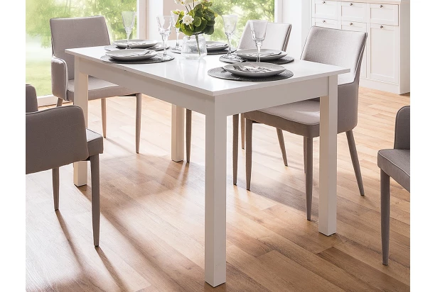 Obdĺžnikový jedálenský stôl v bielej farbe o ploche 137×80 cm je vybavený rozkladacou funkciou, vďaka ktorej získa šírku 177 cm. Univerzálnym štýlom sa hodí do moderného i klasického domova.