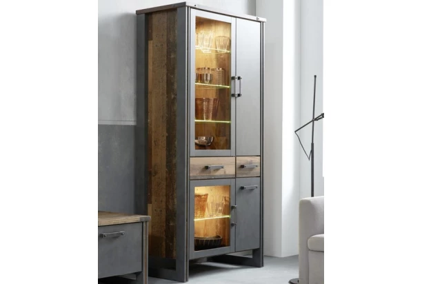 Vysoká vitrína z kolekcie Prime v industriálnom štýle upúta pozornosť už na pohľad skvelou vintage optikou drevených lát a brúseného kovu. Nábytok tak dokonale podčiarkne osobitosť Vášho interiéru.