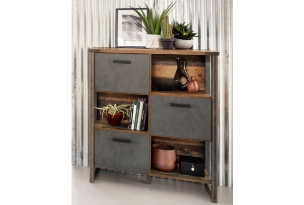 Regál s úložnými priestormi z kolekcie Prime v industriálnom štýle upúta pozornosť už na pohľad skvelou vintage optikou drevených lát a brúseného kovu. Nábytok tak dokonale podčiarkne osobitosť vášho interiéru.
