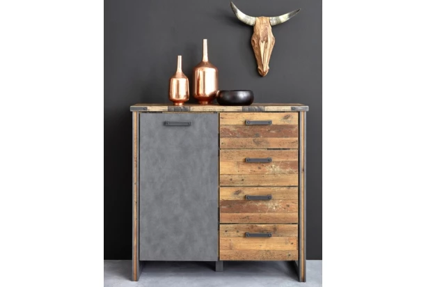 Komoda so zásuvkami z kolekcie Prime v industriálnom štýle upúta pozornosť už na pohľad skvelou vintage optikou drevených lát a brúseného kovu. Nábytok tak dokonale podčiarkne osobitosť vášho interiéru.