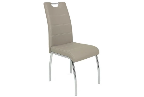 Moderná jedálenská stolička na chromovo lesklej podnoži je zakončená praktickým madlom. Poťah z ekokože v odtieni šedej cappuccino dopĺňa dekoratívny prešiv.