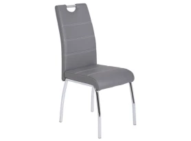 Moderná jedálenská stolička na chromovo lesklej podnoži je zakončená praktickým madlom. Poťah z ekokože v odtieni šedo-hnedé latté dopĺňa dekoratívny prešiv.