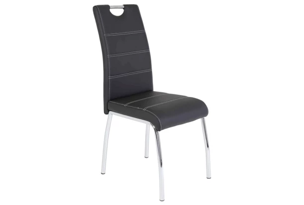 Moderná jedálenská stolička na chromovo lesklom podnoži je zakončená praktickým madlom. Poťah z ekokože v čiernej farbe dopĺňa dekoratívny prešiv.