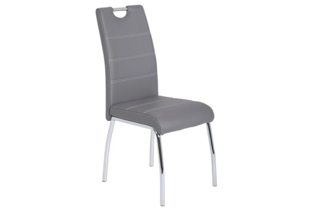 Moderná jedálenská stolička na chromovo lesklom podnoží je zakončená praktickým madlom. Poťah z ekokože v šedej farbe dopĺňa dekoratívny prešiv.