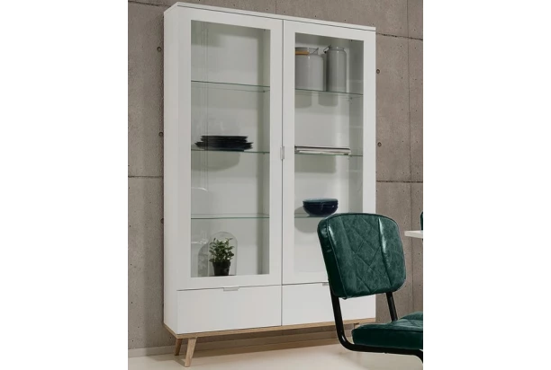 Vysoká vitrína z kolekcie Göteborg v obľúbenom škandinávskom štýle – čisté biele línie nábytku ,podčiarkujú masívne drevené nôžičky s útulným dubovým drevodekórom, vďaka ktorým pôsobí nábytok vzdušne a zároveň veľmi elegantne.