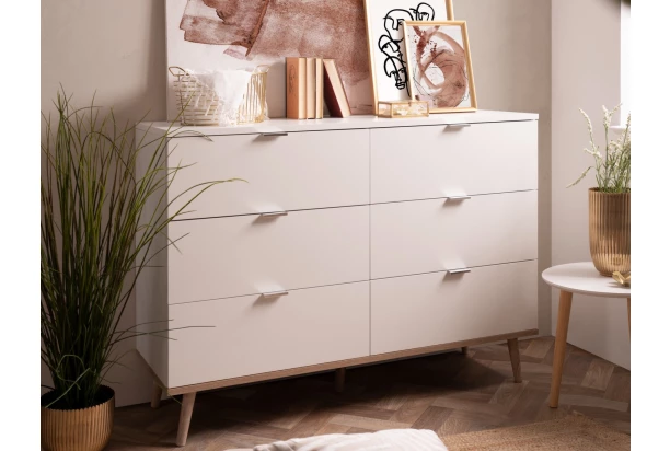 Komoda so 6 zásuvkami z kolekcie Göteborg v obľúbenom škandinávskom štýle – čisté biele línie nábytku podčiarkujú masívne drevené nožičky s útulným dubovým drevodekorom, vďaka ktorým pôsobí nábytok vzdušne a zároveň veľmi elegantne.