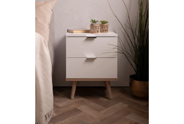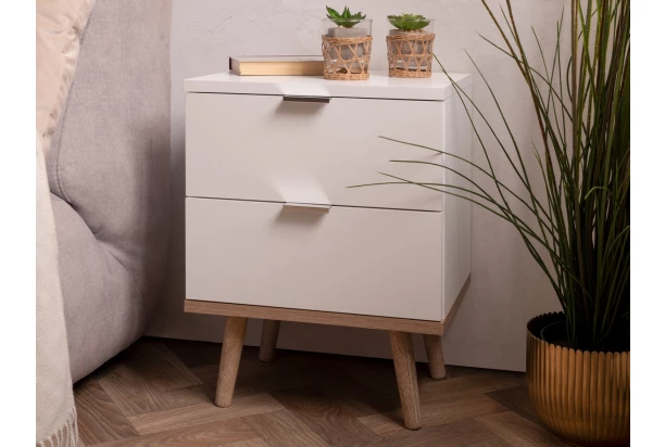 Nočný stolík z kolekcie Göteborg v obľúbenom škandinávskom štýle – čisté biele línie nábytku podčiarkujú masívne drevené nožičky s útulným dubovým drevodekorom, vďaka ktorým pôsobí nábytok vzdušne a zároveň veľmi elegantne.