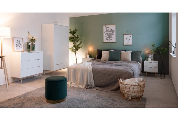 Šatníková skriňa z kolekcie Göteborg v obľúbenom škandinávskom štýle – čisté biele línie nábytku, podčiarkujú masívne drevené nožičky s útulným dubovým drevodekorom, vďaka ktorým pôsobí nábytok vzdušne a zároveň veľmi elegantne.