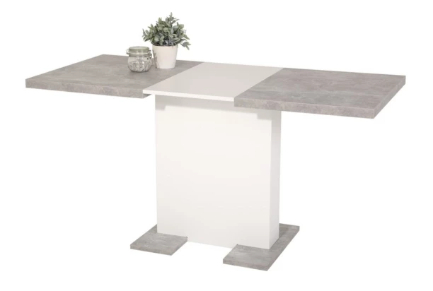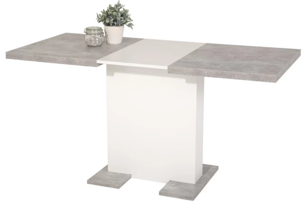 Menšie jedálenský stôl v trendovom štýle má širokú stredovú nohu pre maximálnu stabilitu a rozkladaciu funkciu jedálenskej dosky. Vyrobený v kombinácii bielej farby a imitácie šedého betónu.