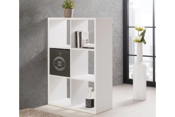Univerzálny regál so širokým rámom a 6 otvorenými priehradkami v usporiadaní 3×2 nájde využitie v každej miestnosti bytu. Vyrobený v bielom prevedení. Priehradky tohto regálu je možné navyše ľubovoľne dopĺňať úložnými boxmi.