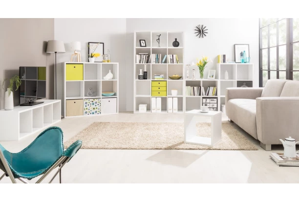 Univerzálny regál so širokým rámom a 4 otvorenými priehradkami v usporiadaní 4×1 nájde využitie v každej miestnosti bytu. Vyrobený v bielom prevedení. Priehradky tohto regálu je možné navyše ľubovoľne dopĺňať úložnými boxmi.