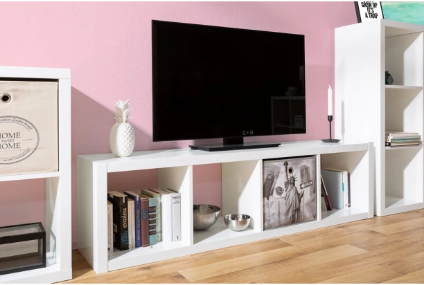 Regál so širokým rámom a 4 otvorenými priehradkami v usporiadaní 1×4 nájde využitie v každej miestnosti bytu. Vyrobený v kombinácii biely lesk / biely mat. Regál možno umiestniť na výšku alebo na šírku a využiť ho aj ako TV stolík. Priehradky regálu môžete navyše ľubovoľne doplniť úložnými boxami.