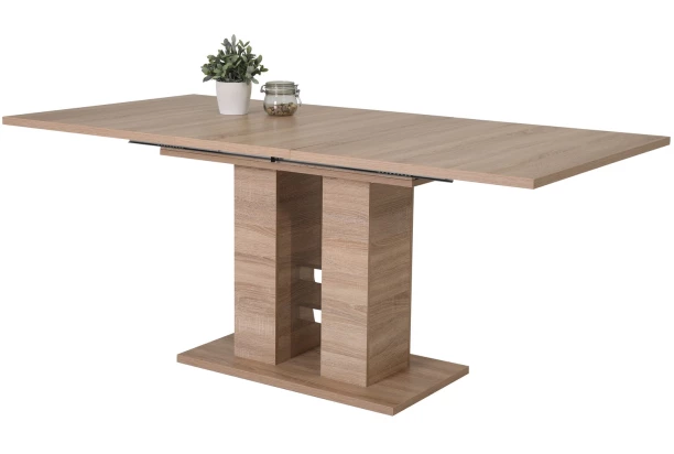 Jedálenský stôl v modernom štýle zaujme zaujímavou podnožkou a poteší praktickou rozkladacou funkciou. Obdĺžnu jedálenskú plochu 140×90 cm možno vďaka prídavným častiam rozložiť na veľkosť 220×90 cm. Útulný dubový dekor sonoma dopĺňajú moderné kovové aplikácie uprostred podnože.