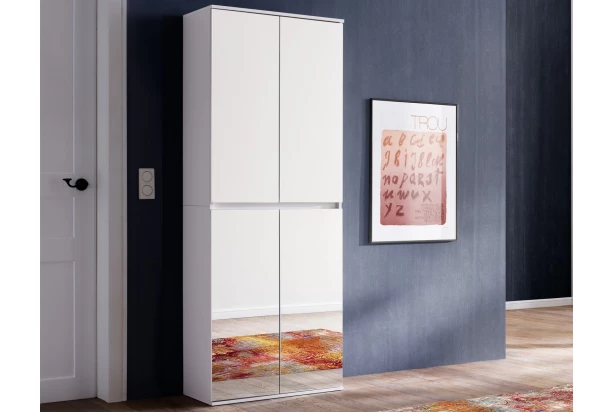 Zrkadlová viacúčelová skriňa so šírkou 74 cm v bielej farbe má moderný minimalistický dizajn a pôsobí úplne nadčasovo. Za 4 otočnými dverami nájdete veľmi praktické úložné priestory so šatníkovou tyčou a mnohými policami, ktoré môžete ľubovoľne výškovo nastavovať a prispôsobiť si tak vnútorný priestor podľa potreby. Táto skriňa sa tak univerzálne hodí nielen do predsiene ako predsieňová šatníková skriňa alebo ako veľký botník, ale tiež napríklad do spálne, domácej pracovne, šatne alebo komory, kde vďaka mnohým vnútorným priehradkám veľmi dobre poslúži pre akékoľvek prehľadné ukladanie vecí. Vďaka zrkadlám bude opticky zväčšovať priestor v miestnosti. Navyše môžete vedľa seba kombinovať aj viac skríň z radu Nevada a Mirror naraz a získať tak naozaj skvelé praktické prostredie pre multifunkčné ukladanie.