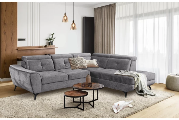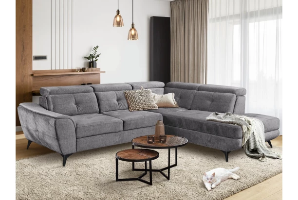 Rohová sedacia súprava Sergio – spojenie moderného vzdušného designu, príjemného pohodlia a praktických vlastností, ktoré potešia každý deň. Polohovateľné opierky, úložný priestor pod otomanom aj rozkladaciu funkciu na lôžko oceníte. Očalúnená zamatovo hebkou látkou v odtieni dymovo šedá. Sedačka s bočným otomanom vytvára pravý roh.