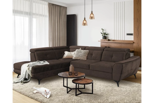 Rohová sedacia súprava Sergio – spojenie moderného vzdušného designu, príjemného pohodlia a praktických vlastností, ktoré potešia každý deň. Polohovateľné opierky, úložný priestor pod otomanom aj rozkladaciu funkciu na lôžko oceníte. Očalúnená zamatovo hebkou látkou v odtieni tmavo hnedá. Sedačka s bočným otomanom vytvára ľavý roh.