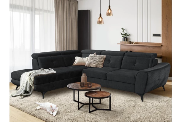Rohová sedacia súprava Sergio – spojenie moderného vzdušného designu, príjemného pohodlia a praktických vlastností, ktoré potešia každý deň. Polohovateľné opierky, úložný priestor pod otomanom aj rozkladaciu funkciu na lôžko oceníte. Očalúnená zamatovo hebkou látkou v odtieni čierna. Sedačka s bočným otomanom vytvára ľavý roh.
