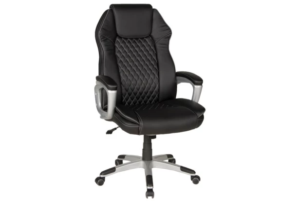 Moderné kancelárske kreslo z čiernej ekokože má zaoblené podrúčky, priestranný sedák a vysoké operadlo v príjemne anatomickom tvare. Moderný design dopĺňa deko prešiv poťahu. Oceníte tiež vysokú nosnosť kresla.