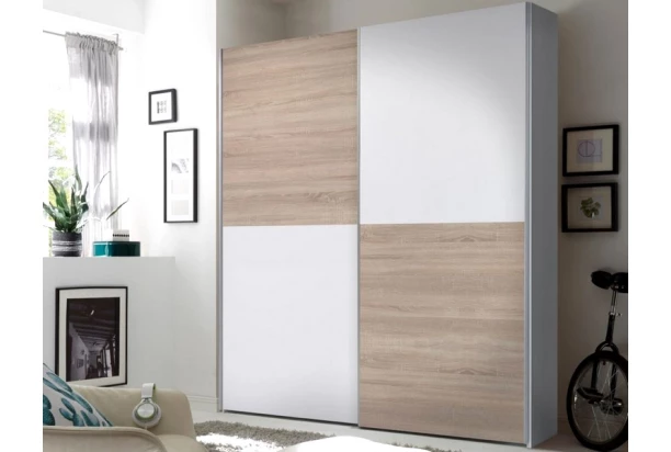 Šatníková skriňa s celkovou šírkou 170 cm nájde svoje miesto aj v menšej spálni, chodbe či v predsieni. Ľahko prístupný vnútorný priestor vďaka posuvným dverám v kombinácii bielej farby a duba sonoma