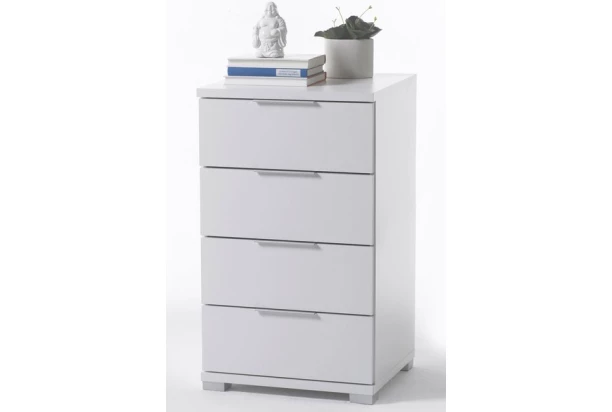 Moderný vysoký nočný stolík ,alebo malá úložná skrinka so 4 zásuvkami v bielej farbe. Ideálne sa hodí k vyššiemu lôžku postele ,alebo poslúži aj ako samostatná malá skrinka kamkoľvek inam.