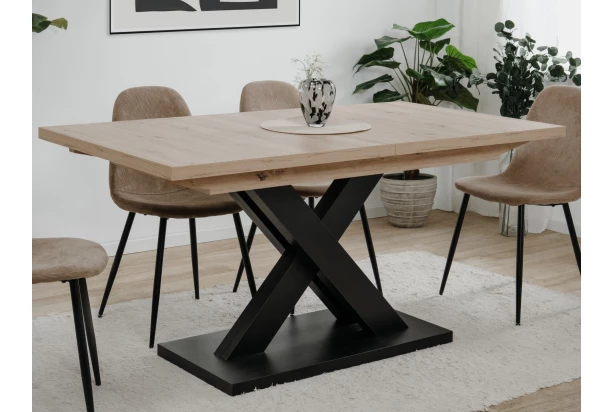 Obdĺžnikový jedálenský stôl s veľkosťou 160×90 cm má moderný dizajn a zaujme na pohľad mohutnou členitou podnožou v tvare písmena X, ktorá mu zároveň dodáva stabilitu počas každodenného používania. Stôl je vyrobený v drevodekóre dub artisan v kombinácii s čiernou. Tento priestranný stôl má navyše rozkladaciu funkciu so synchrónnym mechanizmom a vy tak môžete pohostiť pri stole celú rodinu alebo širší okruh vašich priateľov. Stôl s mohutnou a stabilnou konštrukciou tak bude nielen praktickým kusom nábytku, ale zároveň zaujímavým moderným prvkom uprostred vašej jedálne.