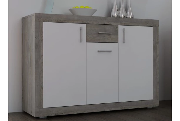 Široká komoda v kombinácii drevodekor dub Ribbeck bielej farby pasuje do mnohých interiérov. Obsahuje otočné dvere i úložnú zásuvku.