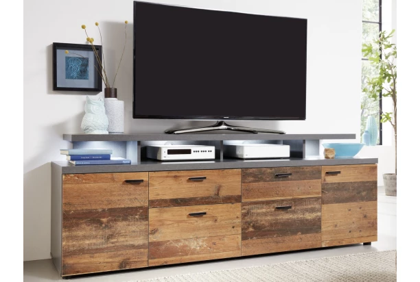 Široká TV skrinka v industriálnom štýle ,upúta pozornosť už na pohľad skvelou vintage optikou drevených lát a šedého brúseného kovu. Nábytok tak dokonale podčiarkne osobitosť vášho interiéru. Vnútorné úložné priestory dopĺňajú praktické priehradky, kde budete mať všetko prehľadne uložené.