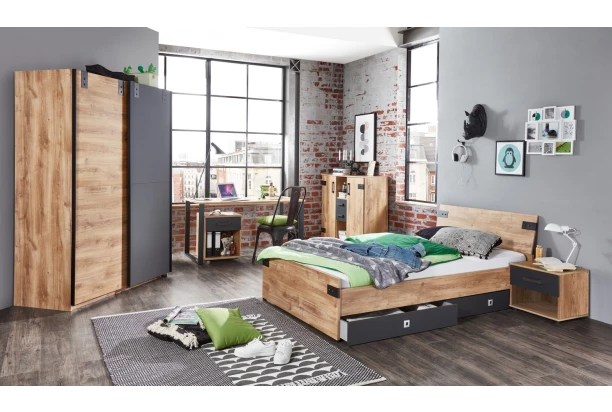 Šatník o šírke 180 cm s posuvnými dverami z kolekcie Liverpool – moderný nábytok v duchu mestského industriálneho štýlu si obľúbia nielen mladí ľudia. Útulný dubový drevodekor dopĺňajú plochy tmavého grafitu a čierne kovové aplikácie.